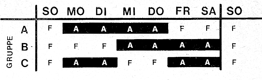 Jede Gruppe arbeitet versetzt an 4 Tagen (9-10 Std./Tag) und hat 3 Tage